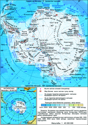 АНТАРКТИДА – Антарктикадагы материк, дээрлик Түштүк уюл тегерегинин ичинде жайгашкан. Аянты 13 975 миң км2. Жээктеринде (узундугу 30 миң кмден ашык) булуң-буйтка аз; бийиктиги ондогон метрге жеткен муздуу тик жарлардан турат. Тынч жана Атлантика океандары тараптан Амундсен, Росс, Уэдделл деңиздери материкке кыйла кирип турат. Түштүк Америка тарапка кууш Антарктида жарым аралы созулуп жатат. Антарктида – дүйнөдөгү эң бийик материк. Муз кыртышынын бетинин орточо бийиктиги 2040 м, башкача айтканда калган бардык материктердин бетинин орточо бийиктигинен 2,8 эсе (730 мге) жогору. Материктин муздун астындагы накта бетинин орточо бийиктиги 410 м; кыйла бөлүгү деңиз деңгээлинен төмөн жатат. Антарктида башка материктерден зор муз каптоосу менен айырмаланат; материктин аймагынын 0,2–0,3% ин (айрым тоо чокулары менен кырка тоолорду, ошондой эле жээктердеги чакан жерлерди – Антарктида оазистерин) гана муз каптаган эмес.