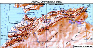 АТЛАС, А т л а с т о о л о р у ‒ Африканын түндүк-батышындагы тоо системасы. Марокко, Алжир жана Тунис өлкөлөрүнүн аймагында. Узундугу 2000 кмдей. Эӊ бийик жери Марокконун аймагында ‒ Тубкаль чокусу, 4165 м.
