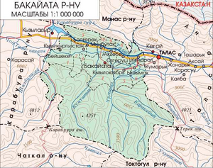 БАКАЙ-АТА РАЙОНУ (1992-жылга чейин Л е н и н п о л ь р а й о н у) Талас облусунда 1936-жылы уюшулуп, 1953-жылы Талас районуна кошулган. 1977-жылы кайрадан Ленинполь району болуп түзүлүп, 1992-жылдан азыркыдай аталат. Чыгышынан Талас, батышынан Кара-Буура, түштүгүнөн Токтогул, Чаткал (Жалал-Абад облусу), түндүгүнөн Манас райондору м-н чектешет. Аянты 2,3 миң км2. Калкы 54,1 миң (2004). Райондо 9 айыл өкмөтү, 19 кыштак бар. Борбору - Бакай-Ата (мурдагы Ленинполь) кыштагы. Район Талас өрөөнүнүн борбордук бөлүгүнөн орун алган. Түштүгүндө Талас Ала-Тоосу (эң бийик жери Күмүштак чокусу - 4251 м), түндүгүндө Эчкили тоосу (2500 м) жатат. Кен байлыктары: күмүш, мрамор, акиташ теги ж. б. Климаты континенттик, июлдун орточо температурасы 20°С, январдыкы -6...-10°С. Жылдык жаан-чачыны 300 мм. Ири суулары: Үрмарал, Талас, Күмүштак. Өрөөнү боз, тоо бөлүгү күрөң топурактуу. Тоо бөлүктөрүнө ландшафттын бийиктик алкактуулугу мүнөздүү. Кургак талаа, талаа ж-а шалбаа өсүмдүктөрү басымдуу. Райондо облустун калкынын 19,6% (2004) жашайт. 2003-жылы калктын төрөлүү деңгээли 31,1% (облуста - 27,5%), өлүм-житим - 6,7% (6,7%), табигый өсүш