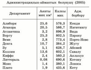 департаментке бөлүнөт. Бенин – БУУнун, Африка союзунун, Батыш Африка экономикалык бирикмесинин, Жалпы африка-маврика уюмунун ж. б. мүчөсү. Акча бирдиги – Батыш Африка валюта союзунун франкы. Бенин – унитардык мамлекет. Конституциясы 2.12.1990-жылы кабыл алынган. Башкаруу формасы – президенттик республика. Мамлекет ж-а өкмөт башчысы – президент. Мыйзам чыгаруу бийлигинин жогорку органы – бир палаталуу Улуттук чогулуш. Саясий партиялары: Бениндин