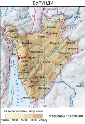 БУРУ́НДИ , Б у р у н д и Р е с п у б л и к а с ы – Африканын борбордук бөлүгүндөгү мамлекет. Түндүгүнөн Руанда, чыгышынан жана түштүк-чыгышынан Танзания, батышынан Конго Демократиялык Республикасы