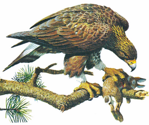 БҮРКҮТ (Aquila chrysaetus) – туйгундар тукумундагы кыраан куш. Узундугу 90 сантиметрге, канатын жайганда узундугу 2 метрге жетет. Борбордук Азиянын бардык тоо кыркаларында таралган. Жайында деӊиз деӊгээлинен 2–3 миӊ метр бийик зоолордо жашайт. Уясын аска-зоолорго салып, аны башка жырткыч канаттуулардан кылдат кайтарат. Март айында 1–2 жумуртка тууп, ургаачысы 45 күндө басып чыгарат. Бүркүт – көзү курч, кыраан жырткыч куш. Түлкү, суур, эчки-теке, улар жана башкаларды алып азыктанат. Кыргыздар эзелтен