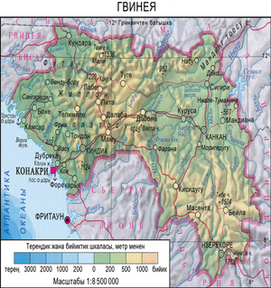 ГВИНЕ́Я, Г в и н е я Р е с п у б л и к а с ы – Батыш Африкадагы мамлекет. Түштүгү менен түштүк- батышынан Либерия жана Сьерра-Леоне, чыгышынан Кот- д’Ивуар, түндүк-батышынан Гвинея-Бисау, түндүгүнөн Сенегал, түндүк жана түндүк-чыгышынан Мали менен чектешет. Батышын Атлантика океаны чулгайт. Аянты 245,9 миӊ км2. Калкы 13,1 млн (2020, башка маалыматтар боюнча 9,5 млн). Борбору – Конакри шаары. Мамлекеттик тили – француз тили. Акча бирдиги – гвинея франкы. Административдик