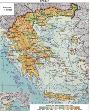 ГРЕ́КИЯ , Г р е к и я Р е с п у б л и к а с ы – Түштүк Европадагы мамлекет. Балкан жарым аралынын түштүк бөлүгүнөн жана ага жакын жаткан аралдардан (100дөн ашуун; ирилери: Крит, Эвбея, Родос, Лесбос ж. б.) орун алган. Грекия түндүк- батышынан Албания, түндүгүнөн Македония,