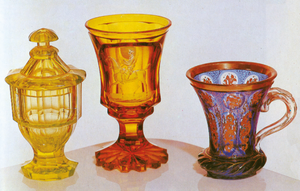 Түстүү айнекке түшүрүлгөн сыр боёктуу идиштер. Богемия, 1830–1840.