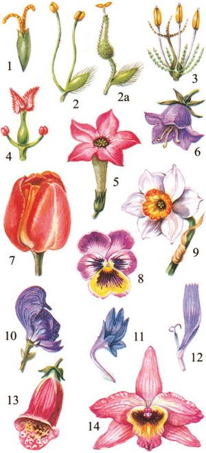 Гүлдөр: 1 – ала батанын энелик гүлү; 2 – талдын аталык, 2а – энелик гүлү; 3 – камыш; 4 – ак чечек; 5 – тамеки; 6 – коӊгуроо гүл; 7 – мандалак; 8 – алагүл; 9 – нарцисс; 10 – уу коргошун; 11 – көк баш; 12 – даргын; 13 – оймок гүл; 14 – арала гүлдөрү.