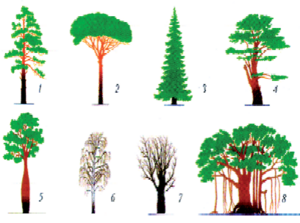 Дарактын түрдүү формалары: 1 – кадимки мырза ка­рагай; 2 – италия мырза карагайы; 3 – карагай; 4 – ливан бал карагайы; 5 – бөтөлкө дарак; 6 – мажүрүм ак кайыӊ; 7 – ак тал; 8 – баньян.