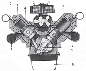 Дизель кыймылдаткыч: 1 – газ чыгаруучу түтүкчө (потрубок); 2 – бүрккүч (форсунка); 3 – муздаткыч суу; 4 – поршень; 5 – аба сүзгүч; 6 – аба кыскыч; 7 – цилиндр; 8 – шатун; 9 – ийиндүү бөлүк; 10 – май чөмүлткүч.