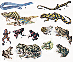 ЖЕРДЕ-СУУДА ЖАШООЧУЛАР , а м ф и б и я л а р (Аmphibiа) – жер бетинде жашоочу омурткалуу жаныбарлар классы. Булар – адегенде сууда жашап, кийин сууда да, кургакта да жашай баштаган алгачкы омурткалуу жаныбарлар. Балыктар сыяктуу урук таштайт, метаморфоз жолу м-н өөрчүйт. Дене температурасы туруксуз, чөйрөгө жараша өзгөрүп турат. Азыркы амфибиялардын 3 түркүмгө (бутсуз, куйруктуу ж-а куйруксуз жерде сууда жашоочулар.) бириккен 25–30дай тукуму, 4000дөн ашык түрү белгилүү. КМШ өлкөлөрүндө 13 тукумдун 34 түрү, Кыргызстанда 4 түрү кезигет. Бутсуздарынын денеси сүйрү, куйругу ж-а буту жок. Куйруктуулардын куйругу жакшы өрчүгөн, буту ичке, кыска.