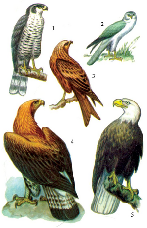 Жырткыч куштар: 1 – карчыга куш; 2 – кулаалы; 3 – кызыл айры куйрук; 4 – бүркүт; 5 – ак баш суу бүркүт.