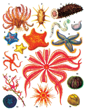 Ийне терилүүлөр: 1 – деңиз лилиясы; 2–5 – голотуриялар; 6–12 – деңиз жылдыздары; 13–16 – деңиз кирпи­лери.