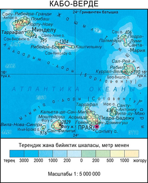 ла түзөңдүгү м-н айырмаланат, бийиктиги 436 мге чейин. Бузулган жанартоо конустары ж-а кальдералары, лава платолору кеңири таралган. Тропиктик пассаттык климат өкүм сүрөт. Эң жылуу айларынын (сентябрь–октябрь) орточо температурасы жээктеринде 24–26°С, эң суугунуку (январь-февраль) 21–22°С, тоолордо температура 3– 4°Сге төмөн. Аба ырайы жылдын басымдуу мезгилинде кургак ж-а ачык, октябрь – июнда харматан деп аталган кургак ж-а ысык шамалдын таасири астында турат, август – октябрь – жаанчыл мезгил. Жаан-чачындын өлчөмү (жылына 300 ммге чейин) жылдар боюнча бирдей эмес, кургакчылык басымдуу, тоолордо нөшөрлөгөн жамгырдан кыртыш жуулуп кеткен учурлар да болот. Ири аралдарында мезгил-мезгили м-н соолуп калуучу кыска суу тармактары арбын. Калыбына келип туруучу суу ресурстары өтө аз (0,3 км3); өлкөнүн ар бир тургунуна жылына 634 м3 суу туура келет. Чарбада негизинен жер астындагы суу пайдаланылат. Суунун 90%и айыл чарбасында (сугат жеринин аянты 1821 га), 7,3% коммуналык-тиричилик чарбасында, 1,8%и өнөр жай ишканаларында керектелет. Жери айыл чарбасында көп жылдар бою ж-а сарамжалсыз пайдаланылгандыктан, антропогендик чөлдөшүүгө кыйла дуушарланган. Жер кыртышы эрозиядан өтө жабырланып, таштак топурактар кеңири таралган. Өсүмдүктөр дүйнөсүнө жарды, ксерофиттик дарак ж-а бадал өсүмдүктөрү (ажыдаар дарагы, сидероксилон) тоолордун жетүүгө татаал жерлеринде гана кездешет. Дарак өсүмдүктөрүн (акация, эвкалипт) ж-а эрозияга каршы көчөттөрдү отургузуунун эсебинен өлкөдөгү токойлуулук азыр 20%ке жеткен. Жаныбарлар дүйнөсүнө да жарды (жапайы болуп кеткен эчкилер, жашыл мартышка, кемирүүчүлөрдүн бир нече түрү); орнитофаунасы кыйла ар түрдүү (куштардын 40тан ашык түрү уялайт). Жээк суусу балыкка бай. 2003-жылы коргоого алынган табигый аймактын улуттук системасы түзүлгөн (жалпы аянты 1 миң га). Калкы. Креол-кабо-верделиктер өлкөнүн калкынын 73%ин түзөт; атлантика тилдеринде 24,4%и сүйлөйт; португалдар 2%. Калкынын жылдык орточо өсүүсү 0,6%. Төрөлүү (1000 тургунга 24,4 бала) өлүм-житимден (1000 тургунга 6,5 адам) 4 эсе ашык. Калктын 56,4%и эмгекке жарамдуу курактагылар (15–64 жаш), балдар (14 жашка чейинки) 36,9%, 65 жаштан ашкандар 6,7%. Калкынын орточо курагы 20,2 жаш. Жашоонун күтүлгөн орточо узактыгы 71 жыл (эркектердики – 67,7, аялдардыкы – 74,4 жыл). Калкынын 95%и христиандар – көбү католиктер, ошондой эле протестанттар да бар. Өлкөнүн калкынын 82%тейи 3 аралда (56%и Сантьягу аралында) жашайт. Шаар калкы 22% (2007). Ири шаарлары: Прая (калкы 124,7 миң; 2008), Мин-