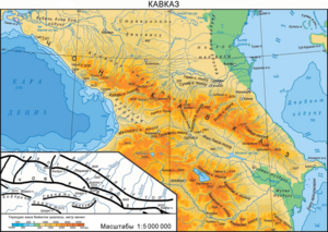 КАВКА́З – Кара, Азов ж-а Каспий деңиздеринин аралыгында жайгашкан табигый аймак. Россия, Грузия, Армения ж-а Азербайжандын чегинде. Түндүктө Кума-Маныч ойдуңунан түштүктө Армениянын Түркия ж-а Иран м-н чек арасына чейин созулат (түштүк табигый чек арасы шарттуу алынган). Түндүк Кавказды, Кавказ өңдүрүн, Чоң Кавказ тоо тармагын ж-а Закавказьени өзүнө камтыйт. Аянты 440,440 миң км2ден ашык. Тоолуу рельеф басымдуу. Борбордук абалды ээлеген Чоң Кавказ тоо тармагы – Россиянын гана эмес, жалпы Европанын да эң бийик жери; анын кыр бөлүгүн Башкы же Суу бөлгүч ж-а Каптал кырка тоолору түзөт. Анын бийик чокулары: Эльбрус (5642 м), Дыхсу (5203 м), Шхара (5068 м), Казбек (5033 м). Чоң Кавказдын кырка тоолору альп тибиндеги рельефи м-н өзгөчөлөнүп турат; көбү куэста тибинде, карст процесстери өрчүгөн (Воронцов, Жаңы Афон үңкүрлөрү, Сатаплиа ж. б.). Чоң Кавказдын түндүк капталынан Кума- Маныч ойдуңуна чейин Кавказ өндүрү ээлейт; андагы Ставрополь дөңсөөсү Кубань-Азов бою ж-а Терек-Кума ойдуңдарынан бөлүп турат. Чоң Кавказ түштүгүндөгү Колхида (батышында) ж-а Кура- Аракс (чыгышында) аккумуляциялык ойдуңдары аркылуу Закавказье тайпак тоолорунан бөлүнөт. Закавказье бүктөлүүдөн пайда болгон Кичи Кавказ кырка тоосунан (Гямыш чокусу, бийиктиги 3724 м) ж-а жанартоодон пайда болгон Армян тайпак тоосунан (5165 м, Чоң Арарат чокусу) турат. Түштүк-чыгышында бүктөлүүдөн жаралган Талыш тоосу (2477 м) ж-а Ленкоран ойдуңу жайгашкан. Кавказ – Жер ортолук деңиз кырчоосундагы альп бүктөлүү аймагына кирген эпигеосинклиналь, бир аз бөлүгү эпиплатформа абалындагы тоолор. Орто бөлүгү өчкөн жанартоо конустары бар Кавказ мегантиклинориясына туура келет. Кен байлыктарга бай: мунай (Баку, Грозный, Майкоп), газ (Краснодар, Ставрополь крайлары), темир (Дашкесан), таш көмүр, марганец, жез, молибден (Тырныауз), коргошун ж-а цинк кенташтары (Садон), минералдуу булактар.