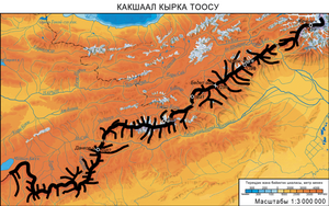КАКШААЛ ТОО ТИЗМЕГИ Теңир-Тоонун түштүгүндө, Кыргызстан м-н Кытайдын чек арасы боюнча 582 кмге созулуп жатат. Эң жазы жери 54 км. Орточо бийиктиги 4500 м. Эң бийик чокулары: Же­ңиш (7439 м) ж-а Аскер топографтары (6873 м). Орографиясы жагынан 3 бөлүктөн турат: чы­гышы Боз-Кыр деп аталып, Сары-Жаз капчы­гайына чейин созулат, айрыктары: Кайыңды,