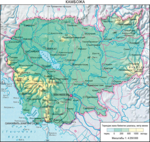 КАМБО́ЖА , К а м­ б о ж а К о р о л д у­г у – Түштүк-Чыгыш Азиядагы мамлекет, Индикытай жарым аралынын түштүгүндө жай - гашкан. Батышы­нан ж-а түндүк-баты­шынан Таиланд, түндүгүнөн Лаос, чы­гышынан ж-а түштүк-чыгышынан Вьет­нам м-н чектешет, түштүгүн ж-а түштүк- батышын Түштүк Кы­тай деңизинин Сиам булуңу чулгайт. Аян­ты 181,0 миң км2, анын 4,5 миң км2ин ички суулар ээлейт. Калкы 17,6 млн (2024). Борбо­ру – Пномпень. Акча бирдиги – риель. Расмий