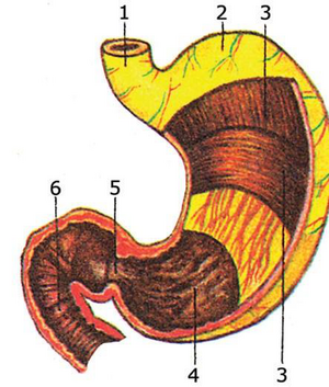 Карын: 1 – кызыл өңгөч; 2 – жалтырак кабык; 3 – булчуңдуу катмар; 4 – былжыр чел; 5 – карынд ын учу; 6 – он эки эли ичеги.