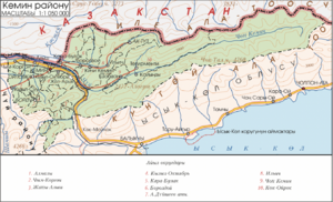 ээлейт. Түндүгүнөн Казакстан, батышынан Чүй району, түштүгүнөн Нарын, түштүк-чыгышынан Ысык-Көл облусу м-н чектешет. Аймагы батыштан чы­гышка 170 кмге, түндүктөн түштүккө 13 кмге созулуп жатат. Аянты 3,5 миң км2. Калкы 51 миң (2022). Райондо 4 шаарча (Ак-Түз, Борду, Кемин, Орловка), 10 айыл округу, 33 кыштак бар. Борбору – Кемин (Быстровка) шаарчасы.
