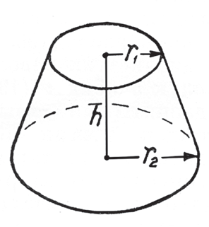 Негизинин радиусу r1, туура кесилишинин радиусу r2, бийиктиги h болгон кесилген конустун көлөмү: Vк.к.=nh(r2+R2+rR)/3.