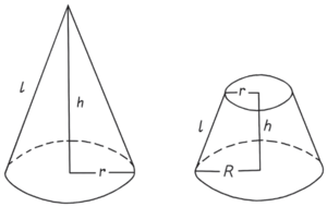 радиусу (r, R), гипотенузасы конустун тү­зүүчүсү (l) болуп эсептелет. Конустун бетин сызган АВ жагы – конустун түзүүчүсү, А чекити анын чокусу. Конустун чокусунан анын негизине чейинки h аралык бийиктиги. Конустун көлөмү nr2h/3, кап­тал бети nrl болот (к. 1-чийме). Эгерде конусту би­ринчи тегиздикке жарыш (параллель) экинчи тегиздик м-н кессек, кесилген конус пайда болот (к. 2-чийме), анын көлөмү n(R2 +r2+Rr)h/3, кап­тал бети n(R+r)l барабар.