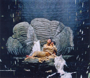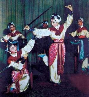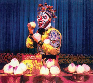 Анда кытай салттуу театрынын негизги белгилери топтолуп, актёр оюну сөз, ыр, бий менен эриш-аркак көрсөтүлгөн. Грим менен костюмда гүл жана оюм-чийим колдонулган.