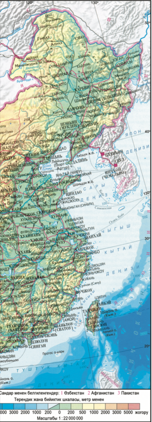 КЫТАЙ (кытайча – Чжунго; кызыл-суулук кыргыздар Жуңго дешет, сөзмө-сөз – Ортонку мамлекет), К ы т а й Э л Р е с п у б л и к а с ы (КЭР; кытайча Чжунхуа жэньминь гунхэго) – Борб. ж-а Чыгыш Азиядагы мамлекет. Чыгышынан ж-а түш.-чыгышынан Тынч океандын Сары, Чыгыш Кытай ж-а Түш. Кытай деңиздери (жээк сызыгынын уз. 18 миң кмден ашуун) м-н чулганат; жээктей көптөгөн арал-