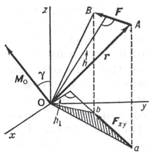 мында F – күч мо­дулу, h – ийини, б. а. Одон күч ара­кет этүүчү сызыкка түшүрүлгөн пер­пенди к у л я рдын узундугу (к. сүрөт). Мо вектору О бор­бору ж-а F күчү аркылуу өтүүчү тегиздикке перпендикулярдуу багытталат. Векторлорду көбөй­түү эрежесинин негизинде К. м. Мо=[F.r] барабардыгы м-н жазылат. Мында r – О күч тиркелген чекитке чейинки жүргүзүлгөн радиус - век­тор. К. м-нин бирдиги (СИ) Н.м, дин.см же кгс.м. О к к о карата К. м.– алг. чоңдук. Ал ушул октогу О чекитине салыштырмалуу К. м-нин проекциясына же F күчүнүн ху тегиздигине болгон проекциясынын сан маанисине барабар.