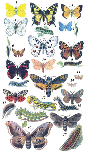 Көпөлөктөр: 1 – сары көпөлөк; 2 – махаон, 2а – эжеке бээсаасы; 3 – шафран сары көпөлөгү; 4 – доло­ночу көпөлөк; 5 – көгүлтүр көпөлөк, 5а –эжеке бээ­саасы; 6 – чоң баш көпөлөк, 6а – эжеке бээсаасы; 7– аполон; 8 – кооз калдыркан, 8а – эжеке бээсаа­сы; 9 – адмирал; 9а – эжеке бээсаасы; 10 – кулмак күүгүмгүлү; 11 – аюу түк калдыркан, 11а – эжеке бээсаасы; 12 – баш сүрөттүү калдыркан, 12а – эже­ке бээсаасы; 13 – эмен жалбырак түргүчү; 14 – ки­йим күбөсү; 15 – мырза карай жибекчи көпөлөгү, 15а – эжеке бээсаасы; 16 – шайтан калдыркан; 16а – эжеке бээсаасы; 17 – сасык жыгач ойгуч, 17а – эжеке бээсаасы.