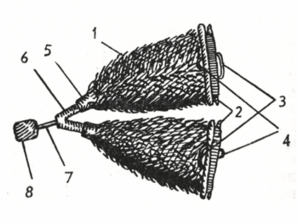 1 - териси; 2 -ооз жыгачы; 3 - манжа бүлдүргөсү; 4 - бармак бүлдүргөсү; 5 -моюну; 6 - көңдөй ача жыгач; 7 - түтүк темири; 8 - өчөк кыш.