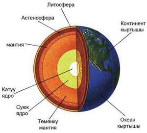 унда калыңдыгы 1–2,5 км келген катмар (чык­кан теги белгисиз, «экинчи» кабат деп аталат) жатат. «Базальт» кабатынын калыңдыгы океан түбүндө 5 кмге жетет. Жер кыртышы м-н м а н т и я н ы н ортосундагы сейсмикалык ыкмалардын негизинде аныкталган чек ара Мо­хоровичич бети деп аташат. Муну Мохо чеги же Мохо бети деп да айтышат. Мохо бетинен ки­йинки калыңдыгы 40 кмге жеткен катуу кат­мар кыртыш алдындагы катмар делет. Жер кыр­тышы м-н кыртыш алдындагы катмар экөө би­ригип, литосфераны түзөт. Мантиянын калың­дыгы 2900 км. Ал үстүнкү мантияга (субстрат; В, С) төмөнкү мантияга (Д., калыңдыгы 2000 км) ажырайт. Үстүнкү мантиянын кыртыш ал­дындагы катмардан кийинки кабаты астенос­фера деп аталат. Ал балкып эриген абалда бо­лот. Ж. я д р о с у н у н радиусу 3,5 миң кмге жакын. Ал сырткы ядро (Е) ж-а ички ядро (субъядро; G) болуп бөлүнөт (к. сүрөт). Аларды калыңдыгы 300 кмге жеткен өтмө зона (F) бөлүп турат (адатта муну сырткы ядрого кошушат). Ж-дин курамында Fe, O, Si, Mg басымдуулук (Ж. массасынын 90%) кылат. Жер кыртышы­нын жарымын кычкылтек, чейрегин кремний, бир топ бөлүгүн Al, Mg, Ca, Na ж-а K түзөт. Ядро Fe м-н Mgге бай оор минералдардан турат. Сейсмикалык толкундардын таралышынан улам сырткы ядро суюк, ал эми ички ядро (субъядро) катуу абалда деп болжолдонот.