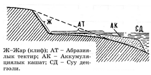 күчүнө, жээктеги тоо тектердин курамына байланыштуу. Абразиянын натыйжасында жээкте абразиялык (жемиринди) тектир менен жар (клиф) түзүлөт. Айрым учурда жээк жемирилип отуруп кашаты тегизделип, жайык формага өтөт. Тоо тектердин Абразиядан пайда болгон кесек сыныктары, кум, чопо жана башкалар толкун менен шиленип, суу түбүндөгү Абразиялык жантаймалардын этегине чогулуп, аккумуляциялык кашатты пайда кылат.
