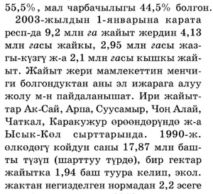 2003‑ж. А. ч‑иыи ,цун; продУкциясы 53565,2 :млн сомдУ тузуп, а. и. дыйкаичылыктыи улушу 55,5%, мал чарбачылЬП'Ы 44,5% болгон.__ 2003‑жылдын 1‑январына карата респ‑да 9,2 млн га жайыт жердин 4,13 :млн гасы жайкы, 2,95 :млн гасы жазгы- кузrу ж‑а 2,1 млн гасы кьпmtы жай­ыт. Жайыт жери мамлеке"I"'I'ин меичиrи болгоидуктаи аиы эл ижарага алуу жолу м‑н пайдалав:ьппат. Ири жайыттар Ак‑Сай, Арпа, Суусамыр, Чон; Алай, Чаткал, Каракужур ереендерувде ж‑а Ысык‑Кел сырттарында. 1990‑ж.