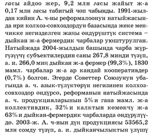 жактав: вегизделгев дыйкаичылык системасыи, А. ч&#8209;ны жургузуу систе:масыи шптеп чьпъш, колдощу аарылчылыгыи туудурат. Кырг&#8209;вда 19,95 :млн га, жалпы жер а.явтывын 54о/ои (10,797 млн za), а. ч&#8209;сывда пайдаланылат. Авыв 1,237 млн гасы айдоо жер, 9,2 млн гасы жайыт ж&#8209;а 0,17 млн гасы табигый чеп чабынды:. 1991&#8209;жылдаи кийин А. ч&#8209;вы реформалоону:в: иатыйж.асыида ири колхоз&#8209;совхоздордун базsсьmца жехе меичикке иегизделгеи жан;ы евдуруmтуR система - дыйкав: ж&#8209;а фермердик чарбалар уюштурулгаи.<br>