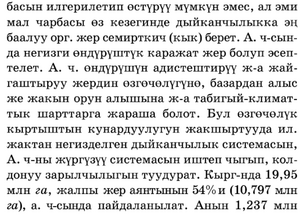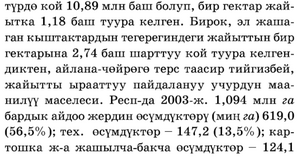 жактаи негиаделген нор:мадаи 2,2 эсеге кеп болгон, ал эми 2003‑ж. шарттуу турде кой 10,89 млн баш болуп, бир гектар жайытка 1,18 баш туура келген. Бирок, эл ж.аmагаи кьпптактардыи тегереги:ндеги жайы'l'"l'ыи бир гектарыиа 2, 74 баm mapirryy кой туура келгендиктен, айлава‑чейреге терс таасир тийгизбей, жайытты ырааттуу пайдалавуу учурдун мааиилуу :маселеси. Респ‑да 2003‑ж. 1,094 :млн га бардык ай,цоо жердин всумдуктеру (миц га) 619,0 (56,5% ); тех. есум.цуктер – 14 7 ,2 (13,5% ); картошка ж‑а Ж8IПЫJIЧа‑бакча есум,цуктер – 124,1